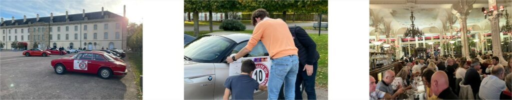 Vendredi 10 octobre, 16h00, les premières voitures entrent sur l’ancienne Place d’Armes du Quartier Villars à Moulins. Cette ancienne Caserne de Cavalerie, Monument Historique, abrite aujourd’hui le Centre National du Costume et de la Scène et sa cour constitue un écrin idéal pour les voitures de sports qui vont participer à cette première édition du Rallye du Bourbonnais. Premiers échanges entre participants, pose de la signalétique avec l’aide des animateurs présents, sous un beau soleil, visite de l’exposition Christian Lacroix, photos puis départ vers l’hôtel et sa salle de réunion ou se tiendra le briefing… On se retrouve ensuite, au Grand Café, restaurant emblématique de Moulins, pour un dîner convivial ou l’on échange sur les passions communes et aussi un peu sur les notions abordées au briefing…